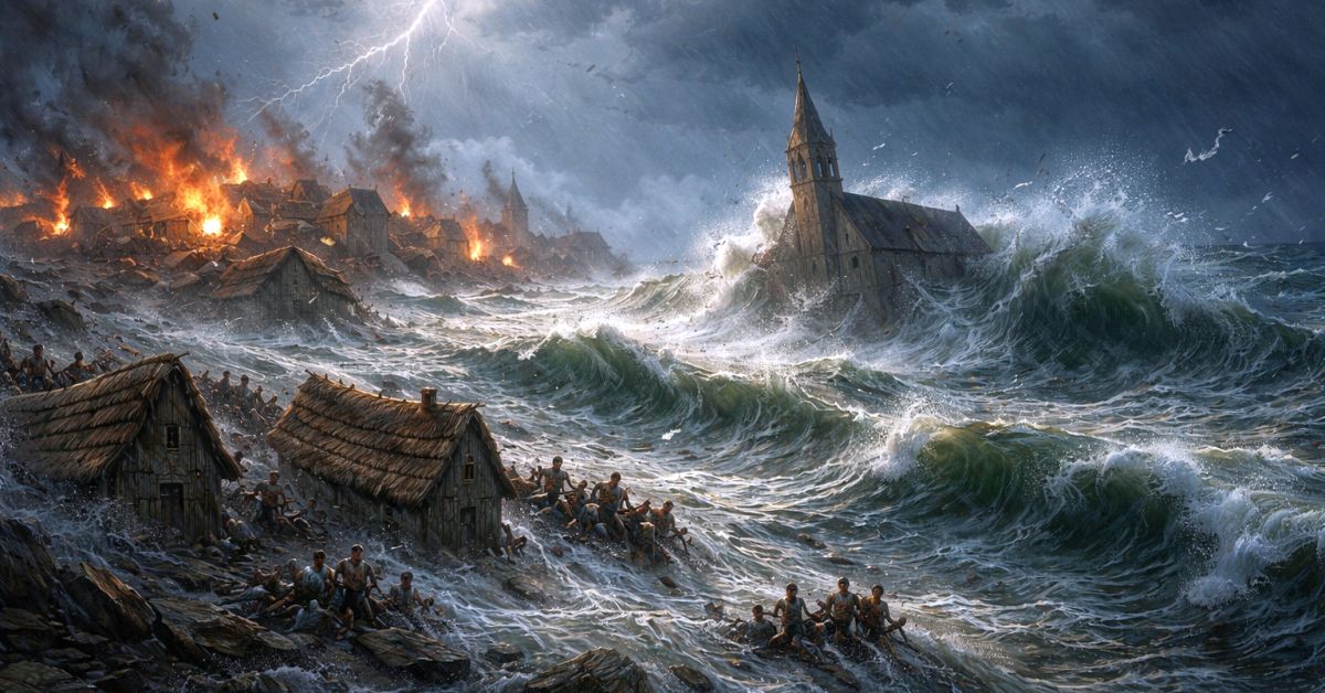Der 16. Januar 1362 begann nicht mit Blitz und Donner, sondern mit Wind. Mit einem starken Wind, der das Meer aufwühlte und die Menschen an der Nordsee erschaudern ließ. Denn dem Wind folgte das Wasser – es war die Nacht der Groten Mandränke, auch Zweite Marcellusflut genannt: eine Sturmflut, die die Deiche brach und Land und Menschen mit sich riss. Gespenstisch: Schon einmal, auch am 16. Januar, aber 1219, war die Region von einer großen Sturmflut, der ersten Marcellusflut, heimgesucht worden.