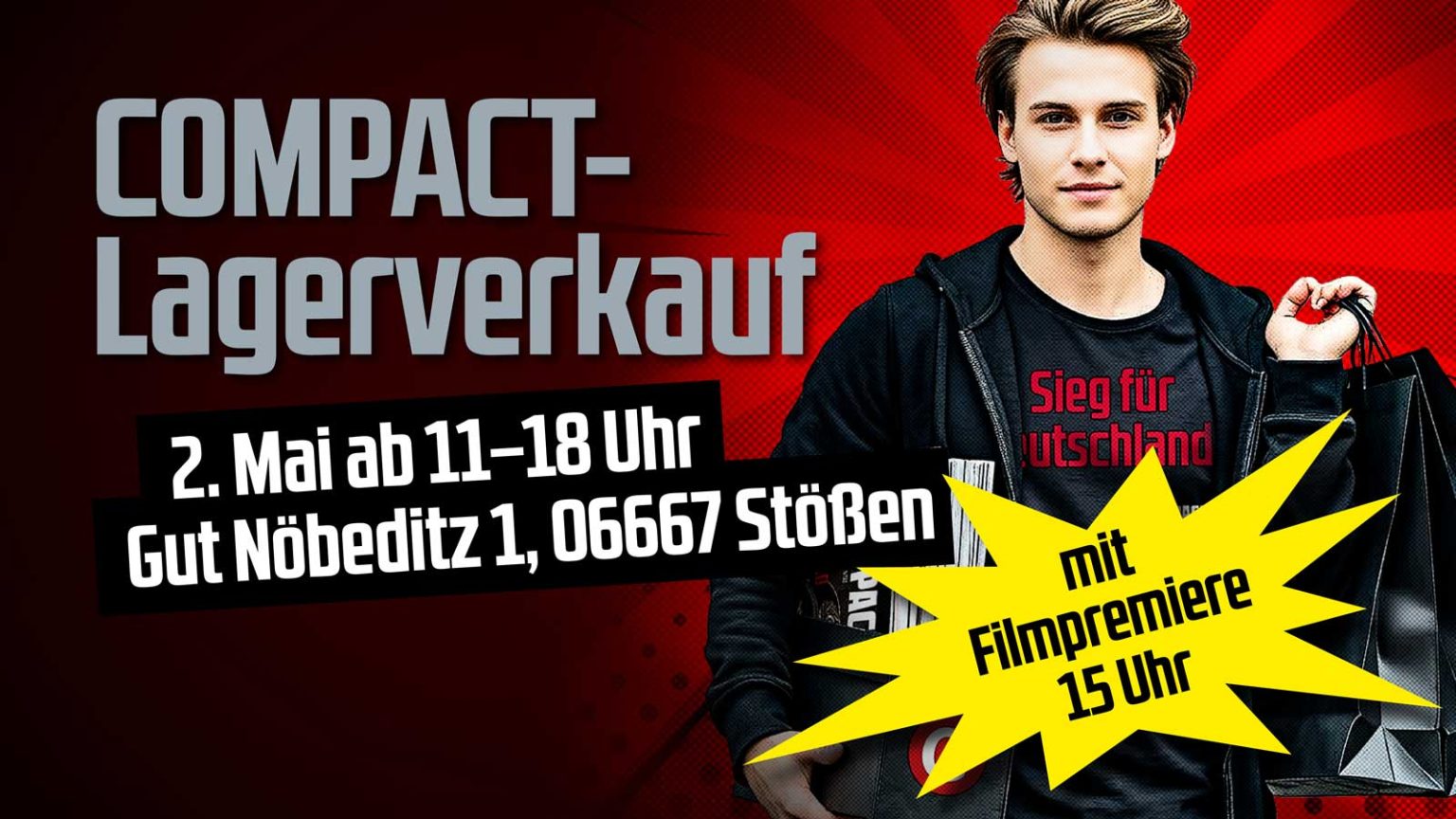 Der Mai ist gekommen! Endlich gibt es wieder den beliebten COMPACT-Lagerverkauf – am 2. Mai 2026 ab 11 Uhr! Diesmal mit Film-Uraufführung „15 Jahre COMPACT“ – und die dazugehörige DVD ist endlich auch erhältlich!