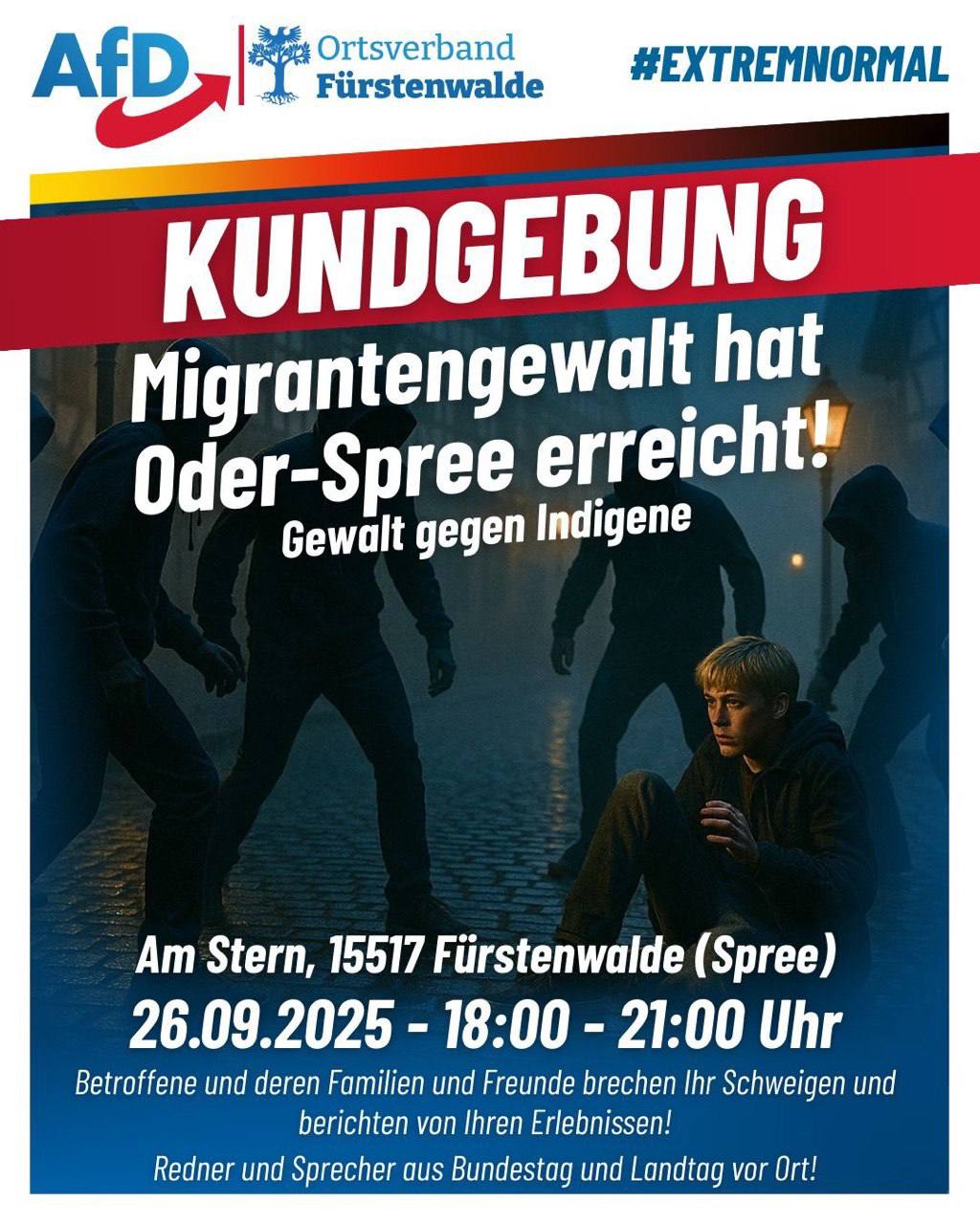 Für Freitag (26. September 2025) ruft die Partei deshalb zu einer Kundgebung unter dem Motto „Migrantengewalt hat Oder-Spree erreicht!“ auf. Beginn ist um 18 Uhr am Stern in Fürstenwalde, neben mehreren Abgeordneten der AfD haben auch Angehörige des Opfers angekündigt, das Wort zu ergreifen und Klartext zu sprechen.