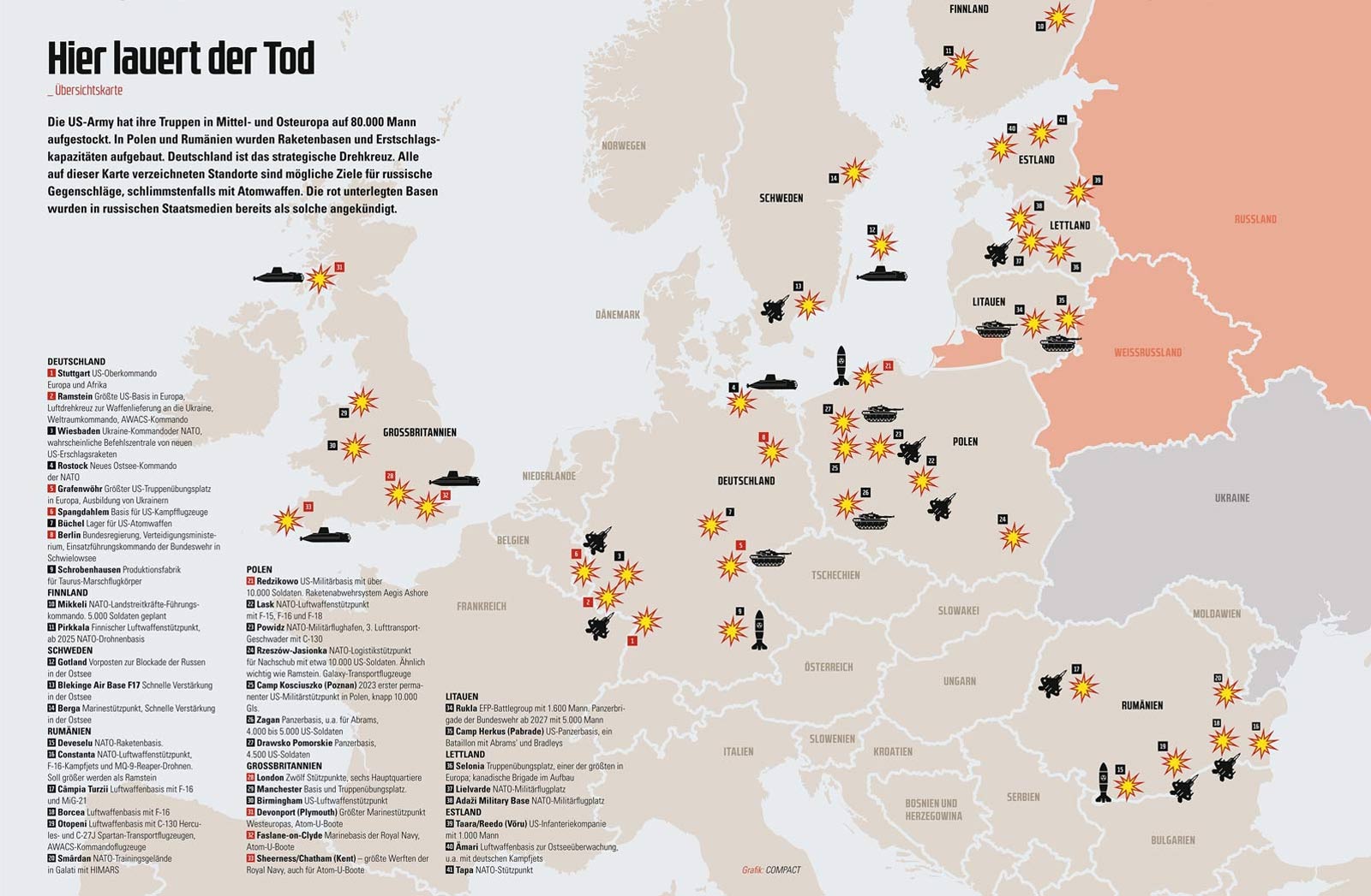 Die „Zentralen des Todes“ in der Kurzbeschreibung – ausführliche Fassung in der neuen COMPACT-Spezialausgabe. Bitte beachten Sie: Fast alle diese Militärzentren wurden in den russischen Staatsmedien bereits als Ziel für Vergeltungsschläge genannt!