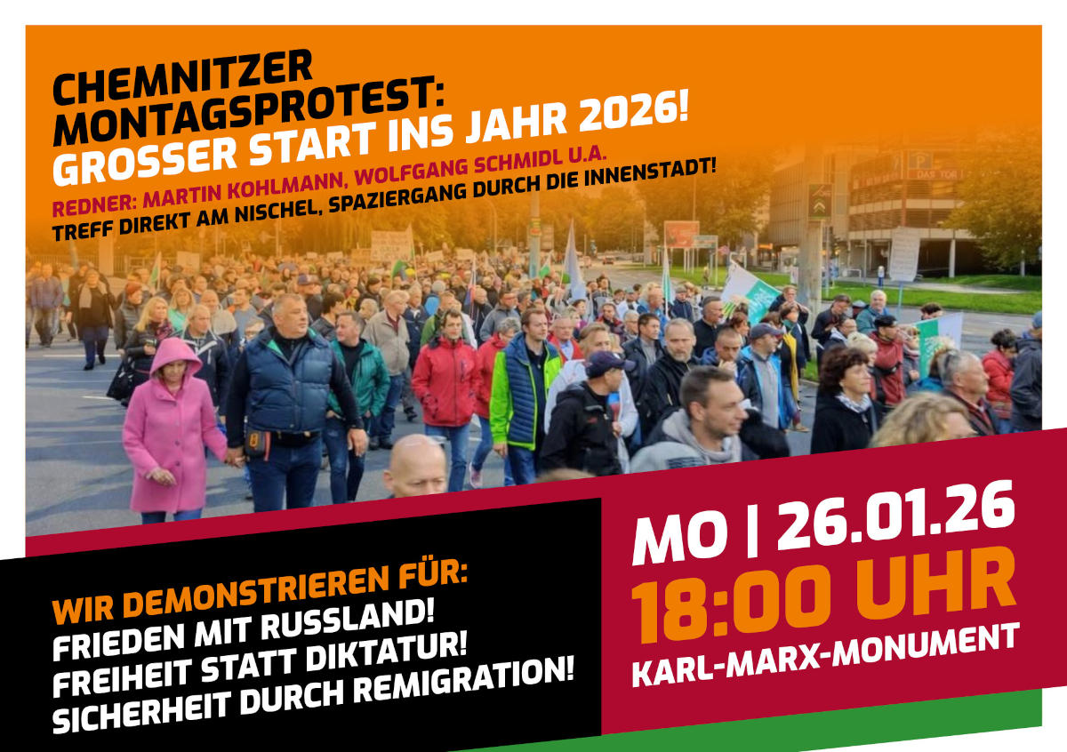 Bereits zu Beginn des Jahres 2026 überschlagen sich die politischen Krisen, regional und geopolitisch. Schon ab den Urnengängen im März könnte das Superwahljahr eine neue Dynamik erleben, der morsche Parteienapparat weiter ins Wanken geraten. Druck auf der Straße, fernab des oft ermüdenden – und zum Zuschauen verleitenden – Parlamentarismus, könnte deshalb wichtiger kaum sein. Weshalb auch in Chemnitz der Straßenprotest zu neuer Stärke geführt werden soll. Ein Anfang dafür ist am Montag (26. Januar 2026) geplant.