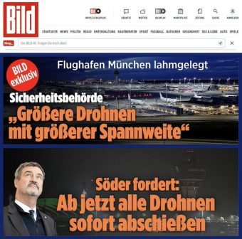 „Das leise Summen der Todesgefahr – und Deutschland hört nur zu“, schrieb die Welt gestern, als ob unsichtbare Bomberflotten im Anflug seien. Tatsächlich soll es sich um Drohnen handeln, die seit Mittwoch zu Flugverboten am Airport München führen – aber es gibt keine Fotos von den Dingern. Da war sogar bei der UFO-Panik vor ungefähr einem Jahr die Indizienlage besser – das Netz wurde damals mit Amateurvideos geflutet. Immerhin, ein paar Aufnahmen aus Dänemark gibt es. Flugobjekte mit bunten fetten Lichtern über Kopenhagen – der böse Russe macht also eigens eine Lightshow, wenn er spionieren will.