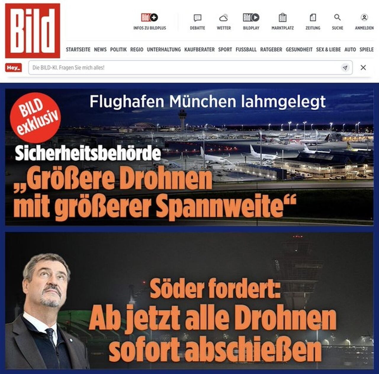 In Deutschland profiliert sich Bratwurst-Söder als Drohnen-Sheriff und will sofort mit dem Abschießen beginnen. CDU-Büchsenspanner Kiesewetter will die Ausrufung des Spannungsfalls, das heißt sofortiges Inkrafttreten der Wehrpflicht und Medienzensur. Die SPD zögert – aber wenn die Panik weiter geschürt wird, dürften die Sozis nachgeben.