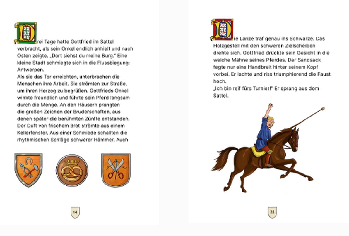 Auch „Gottfried von Bouillon – Der erste Kreuzritter“ erzählt eine Heldengeschichte: Unser Protagonist Gottfried steht kurz vor dem Ritterschlag. Doch dann reißt ihn ein schrecklicher Todesfall aus dem Alltag. Ein gefährliches Abenteuer beginnt, das den jungen Herzog von der Atlantikküste bis nach Jerusalem führt. Wird es ihm gelingen, das Heilige Grab zu befreien?