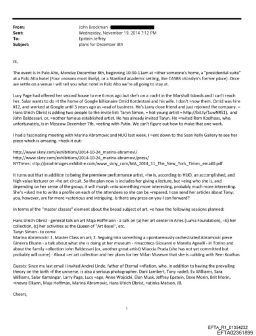 Weiter heißt es in der E-Mail des Literaturagenten an den Sexualstraftäter: «Der Plan sieht nun vor, dass sie einen Vortrag hält, aber da sie Marina Abramovic ist und je nach Gefühl für die Gruppe entscheidet, wird daraus wahrscheinlich etwas viel Interessanteres werden – vermutlich sogar deutlich interessanter. Sie hat mich gebeten, für jeden Teilnehmer ein Profil zu schreiben, damit sie vorbereitet ist. Ich kann ihr Artikel über Tony schicken; du hingegen bist weitaus geheimnisvoller und faszinierender. Gibt es irgendwelche Presseberichte über dich, die ich weiterleiten kann?»