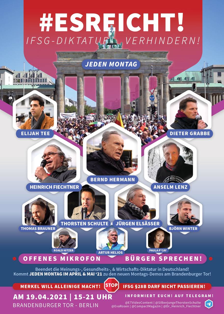 Deswegen heraus auf die Straße! Auf Einladung von Erfolgsautor Thorsten Schulte (Fremdbestimmt) sprechen am Montag, 19.4., ab 15 Uhr am Brandenburger Tor unter anderem Heinrich Fiechtner, Anselm Lenz, Elijah Tee und Jürgen Elsässer. Auch in den Folgetagen soll im Regierungsviertel demonstriert werden, vor allem am Mittwoch (21.4.), am Tag der geplanten Verabschiedung des Notstandsgesetzes. – Die Kundgebung ist angemeldet UND genehmigt, wird also auf jeden Fall stattfinden.