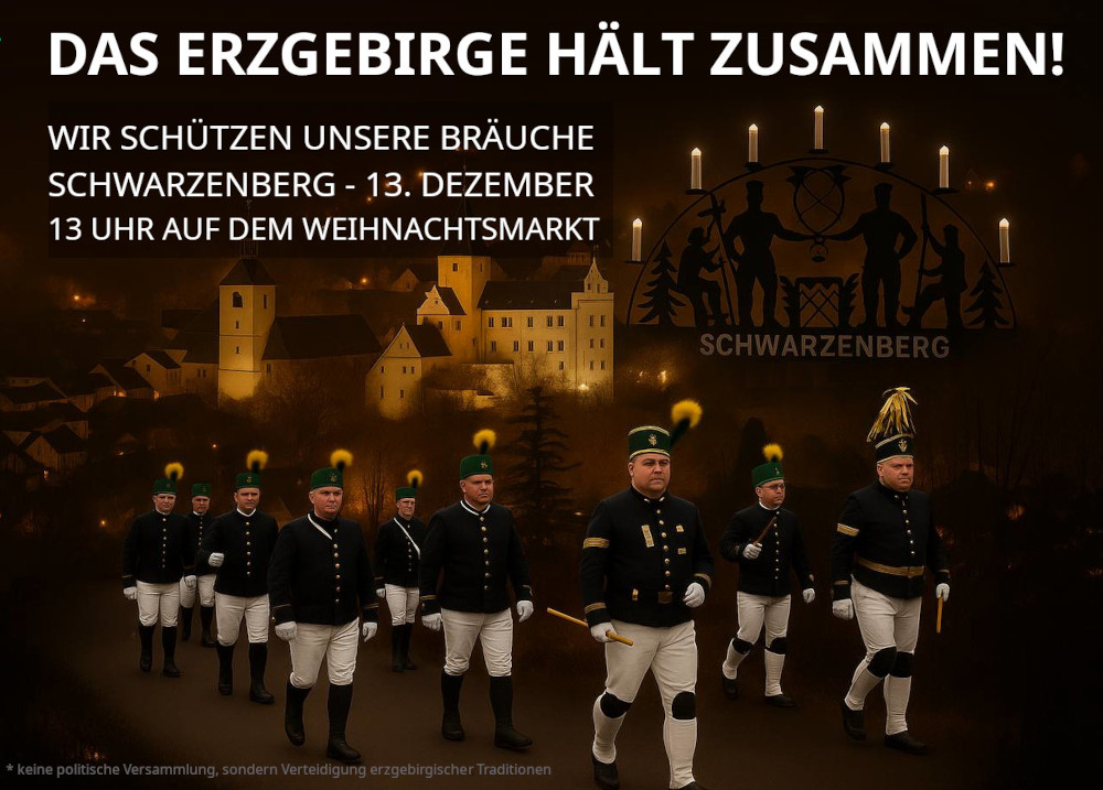 Offensichtlich dämmert den Linken bereits, was sie mit ihrem Vorhaben angerichtet haben: Mehrere hundert Vermummte gestalten dürften auf tausende Erzgebirger treffen, die ein deutliches Zeichen für ihre Traditionen und Werte setzen. Aufgerufen wird zum massenhaften Besuch von Weihnachtsmarkt und Bergparade, um ein friedliches Zeichen, fernab einer politischen Demonstration, zu setzen und deutlich zu machen, dass es sich bei den Störern um eine kleine, überwiegend von außerhalb angereiste Minderheit handelt. „Ich freue mich darauf, dass wir uns alle am 13. Dezember in Schwarzenberg sehen werden und uns gemeinsam einen schönen erzgebirgischen Adventssamstag machen“, äußert sich etwa Kreisrat Stefan Hartung (Freie Sachsen) zum Widerstand der Schwarzenberger Zivilgesellschaft.