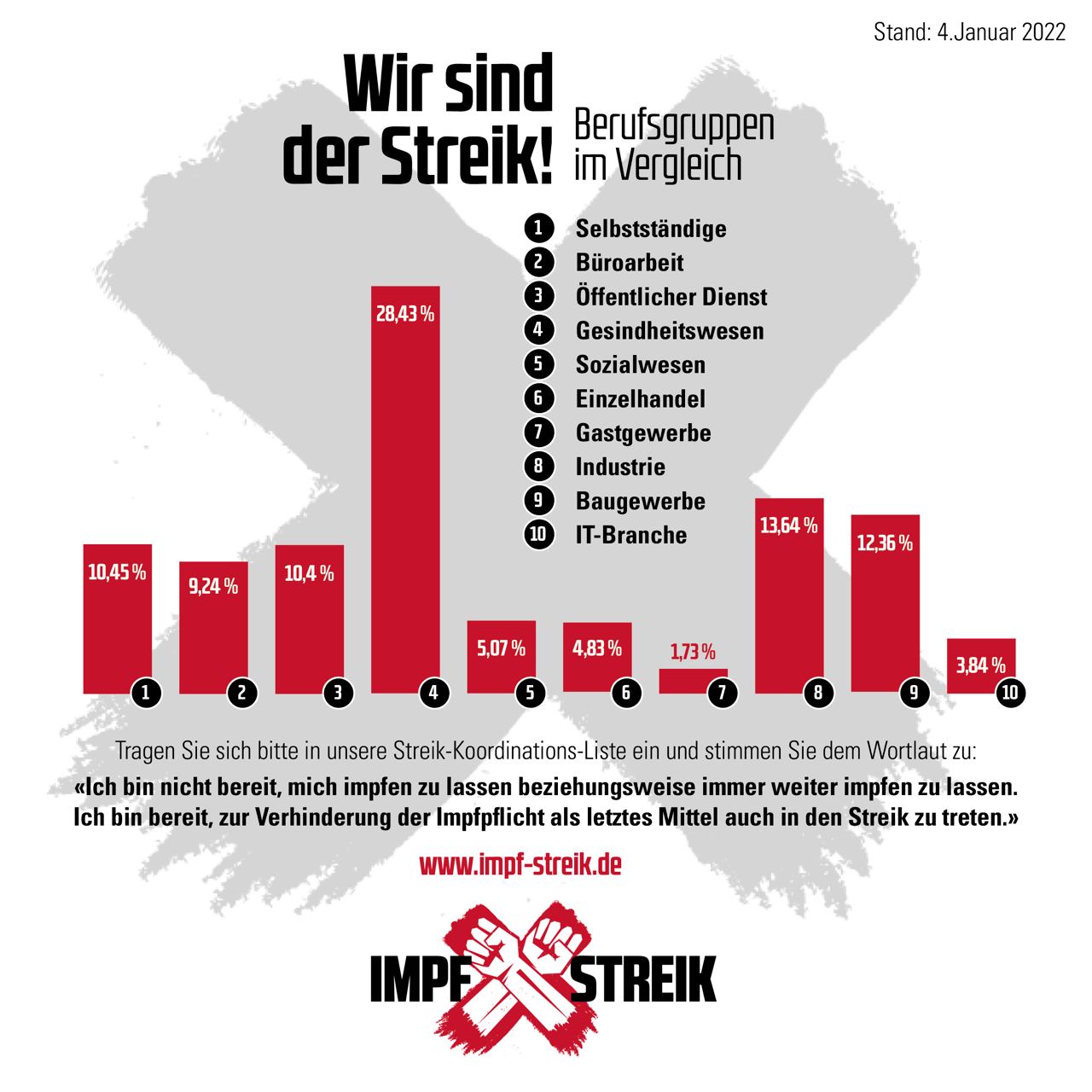 Deshalb ist es so wichtig, dass wir den Impf-Diktatoren die Streikbereitschaft der betroffenen Berufsgruppen demonstrieren – auf dass sie von ihrem ungeheuerlichen Eingriff in das Grundrecht auf körperliche Unversehrtheit ablassen. Dieses Potential muss gebündelt werden, damit wir mit ersten Warnstreikaktivitäten beginnen können. Wer sich in die Listen „Impfstreik? Wir sind bereit!“ einträgt, muss nicht seinen echten Namen angeben – eine funktionierende Email-Adresse genügt. Darüber können wir feststellen, in welchen Regionen sich Streikbereite ballen und diese dann gezielt zu Aktivitäten aufrufen.
