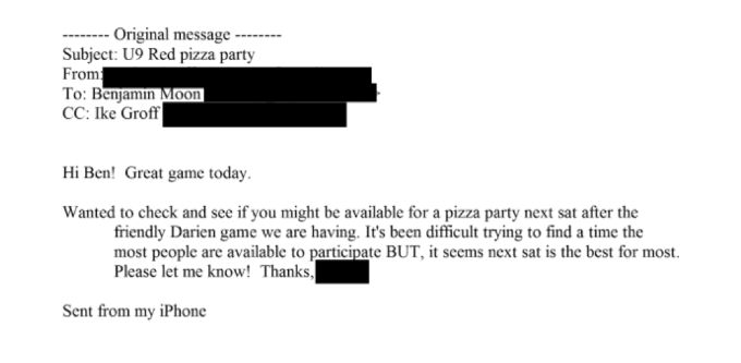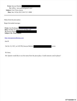 In einem weiteren Schreiben (Absender und Empfänger geschwärzt) ergeht die Anweisung: „Schicke die Pizza zu Bobby“, in einem weiteren, ebenfalls vollständig anonymisierten Dokument heißt es: „Feeney fragt nach der Pizza-Party an diesem Wochenende.“