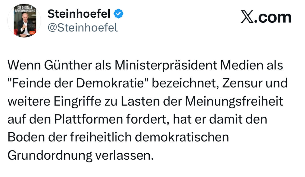 Am Donnerstag äußerte sich Schleswig Holsteins CDU-Ministerpräsident Daniel Günther in der Talkshow Markus Lanz zugunsten einer stärkeren Kontrolle von Medien. Er bejahte sogar ein Verbot. Auf dem Instagram-Account der CDU Schleswig-Holstein bekräftigte er anschließend erneut seine Forderung nach einem Social-Media-Verbot für Kinder und Jugendliche unter 16 Jahren.