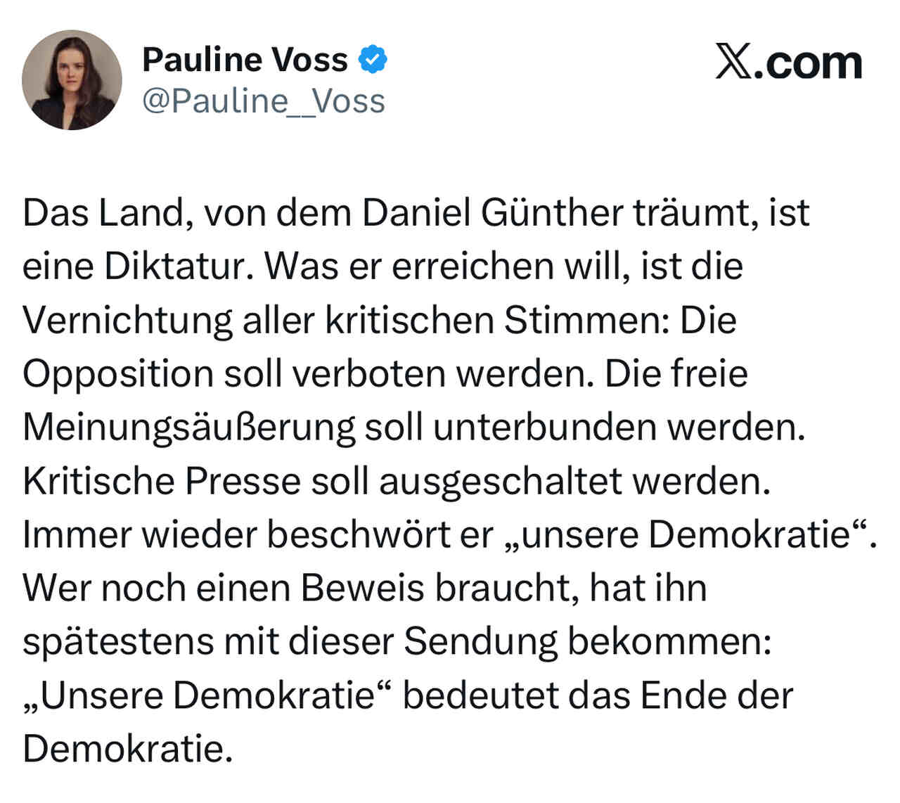 Daniel Günthers Auftritt ist kein Ausrutscher. Er spiegelt den panischen Zustand einer Partei wider, die in Umfragen abrutscht. Statt guter Politik setzt man auf Verbote, Konsenszwang und Medienkampf.
