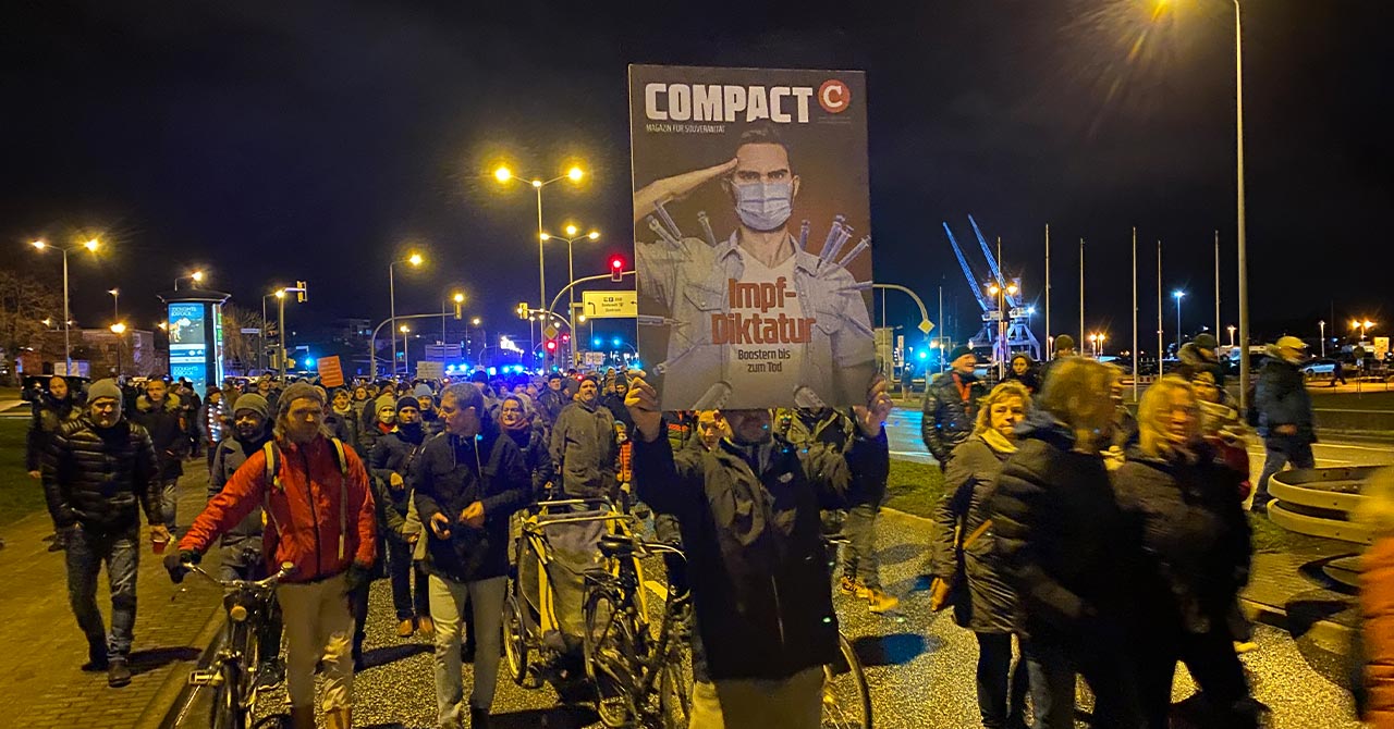 COMPACT-Plakat im Demozug von Rostock – kann man hier bestellen.