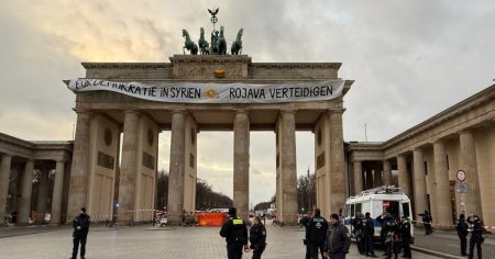 Sie kamen mit einer Hebebühne. Ihre Botschaft: Ein Aufruf zur angeblichen Verteidigung der Demokratie in den syrischen Kurdengebieten. Am Montagnachmittag haben Anhänger…