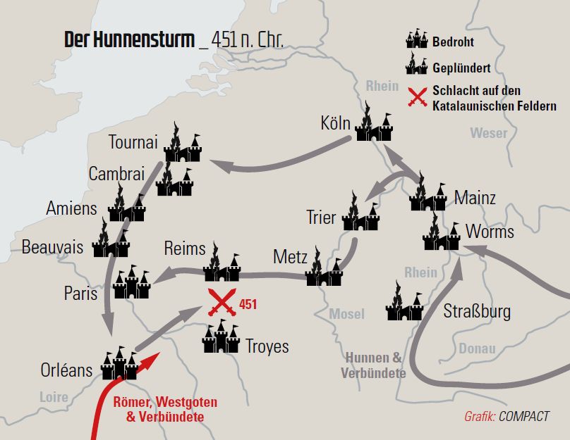 Am 7. April 451 eroberten die Hunnen die Stadt Metz, nachdem sie zuvor den Rhein überschritten hatten und in das Weströmische Reich eingedrungen waren. Erst ein vereintes römisch-westgotisches Heer konnte die Invasoren zurückschlagen. In COMPACT-Geschichte «Die Germanen» lesen Sie alles über die Freiheitskämpfe unserer Vorfahren. Hier mehr erfahren.