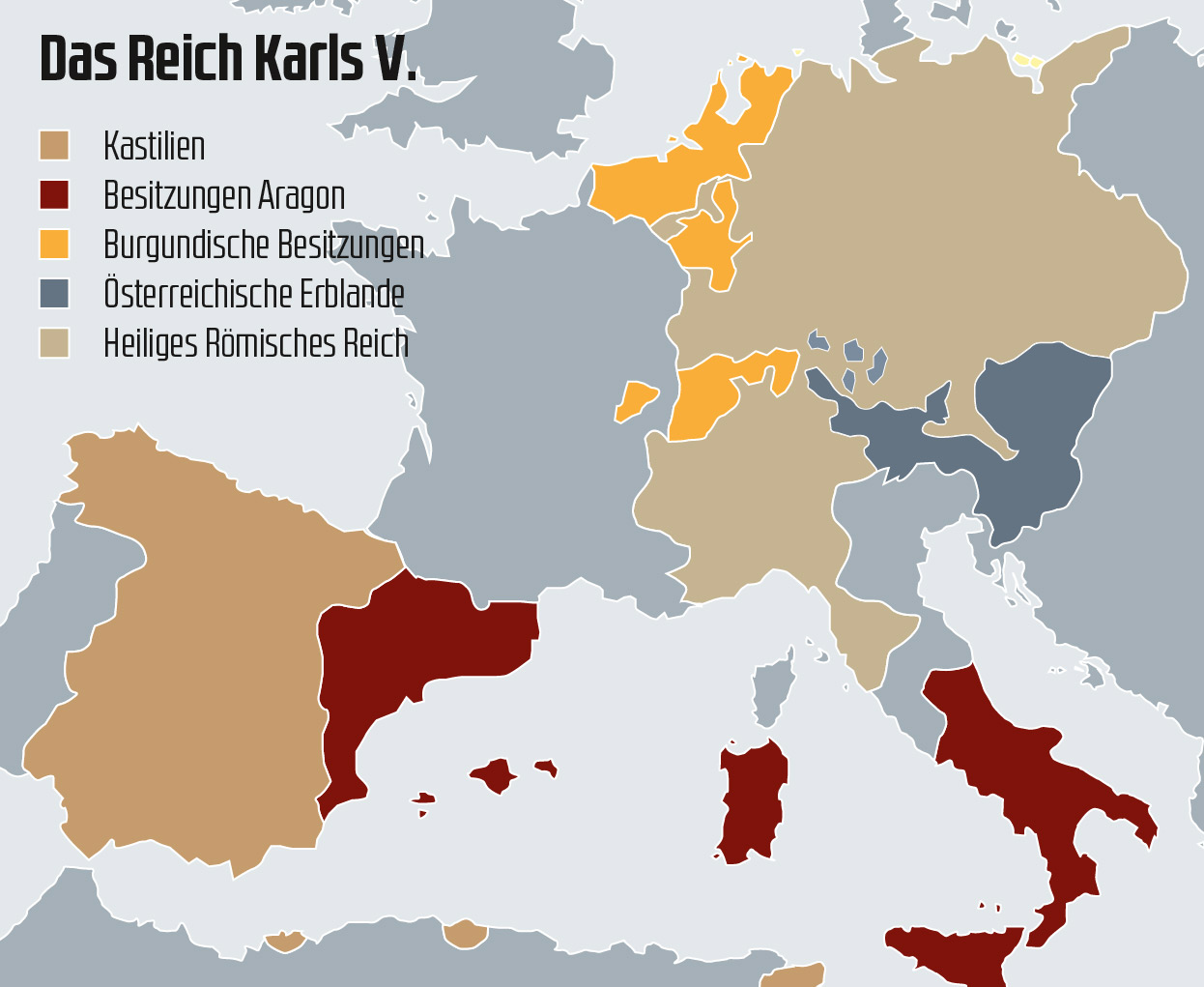 Mit der Wahl Karls V. zum römisch-deutschen Kaiser im Jahr 1519 verschärfte sich die Lage. Als jungen Mann prägten ihn zwei Ereignisse entscheidend: Luthers Reformation und die Eroberung Amerikas. Von seinem Vater Philipp dem Schönen hatte er 1516 auch die spanische Königskrone geerbt, und Spanien wurde schnell zur führenden Kolonialmacht. Die märchenhaften Reichtümer Süd- und Mittelamerikas flossen nach Madrid. Also galt Karls politisches Interesse zunächst der Iberischen Halbinsel.