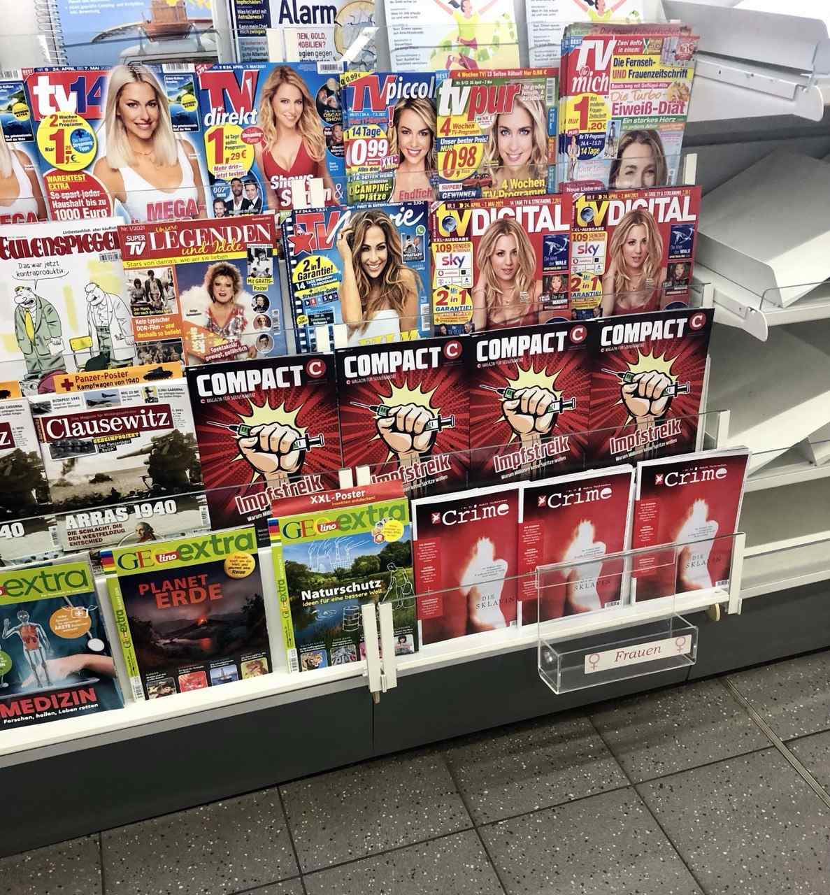 Die Impflobby muss Angst haben, dass die Impfmüdigkeit zunimmt, wenn COMPACT mit seiner überprüfbaren Beweisführung immer mehr Verbreitung findet. Deshalb die Sperre gegen uns auf Youtube. Aber unser gedrucktes Magazin können sie nicht verbieten – es ist an über 17.000 Kiosken im Bundesgebiet frei erhältlich und wird oft sehr gut präsentiert, weil die Verkäufer – anders als die Herren des Internets – nichts von Zensur halten.